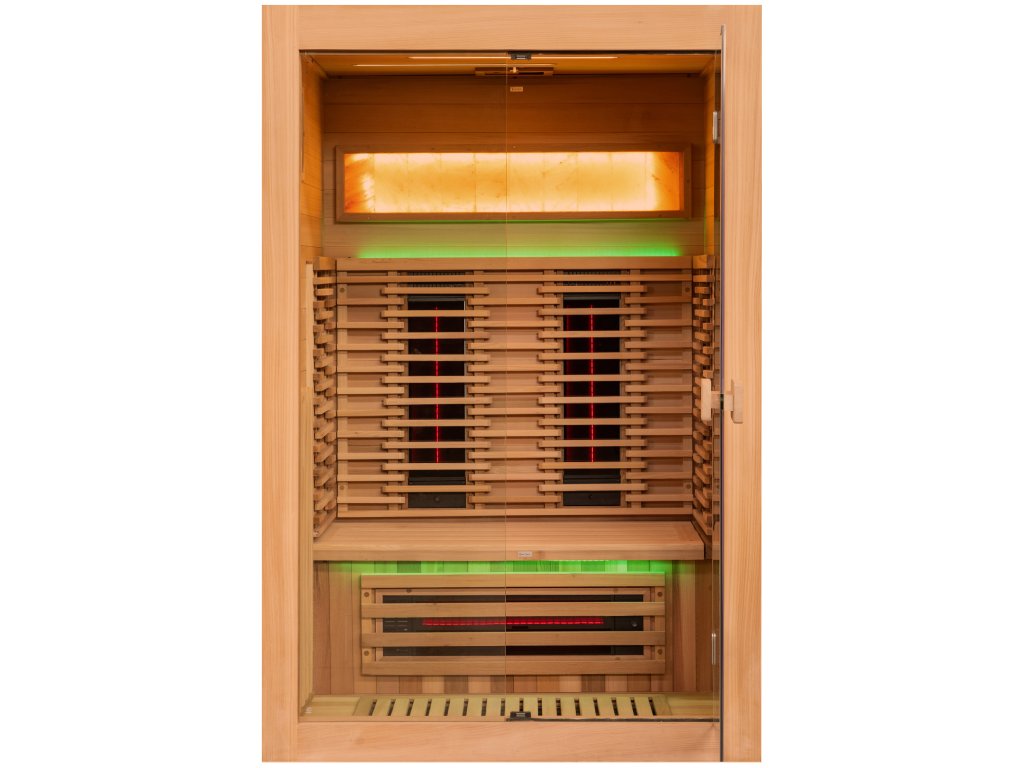 Infrasauna pro 2 osoby, 130x110x200 cm, 7x fullspektrální RedGlass zářič s IR-A filtrem ( 2x záda, 2x boční, 2x přední, 1x lýtkový ) a 1x podlahový karbonový zářič, zónová regulace výkonu, Cedr, světelná terapie, MP3,bluetooth, ionizátor + čistička vzduchu, solná terapie